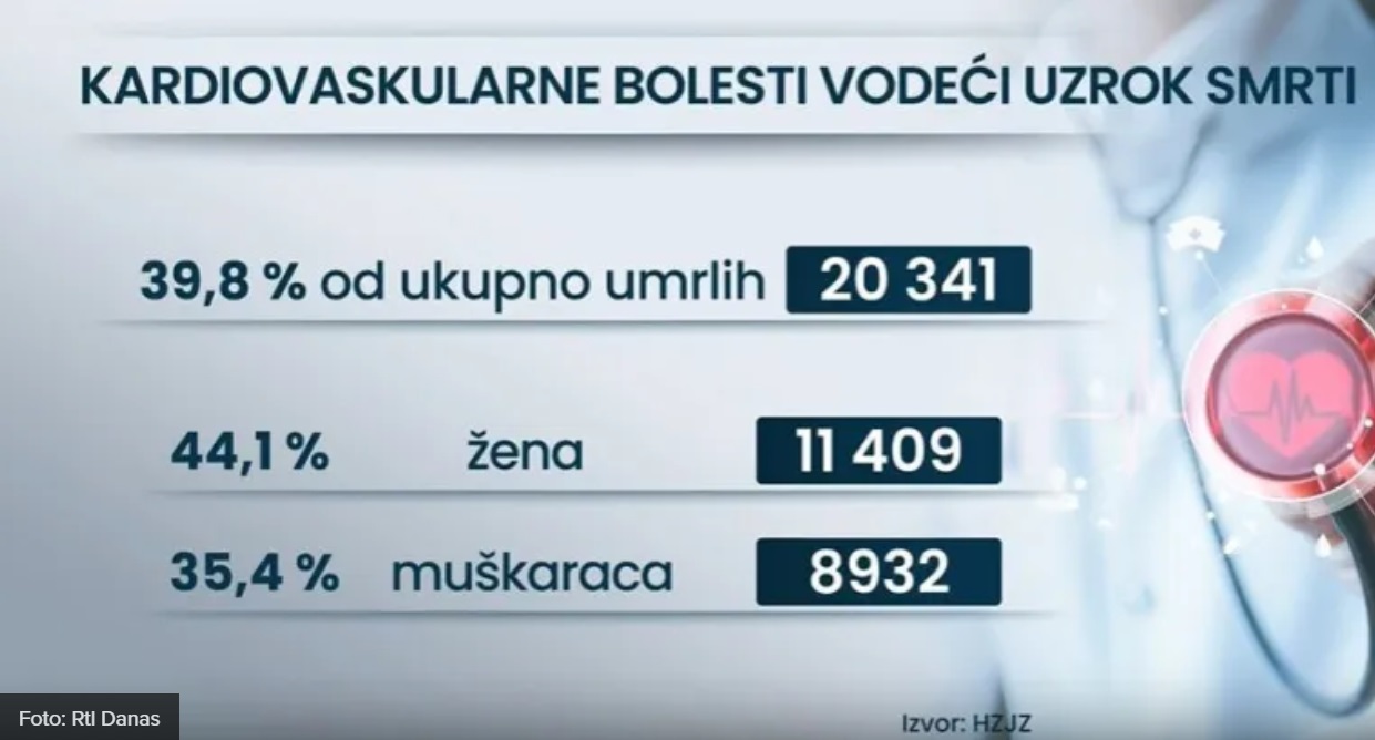 Statistika HZJZ-a pokazuje da su kardiovaskularne bolesti i dalje vodeći uzrok smrtnosti u Hrvatskoj. Samo 2023. od njih je preminula 20.341 osoba, što čini 39,8 % svih umrlih. Više je među njima žena – 44,1 % ili 11.409, dok je udio muškaraca 35,4 %, odnosno 8.932, piše Danas.hr.