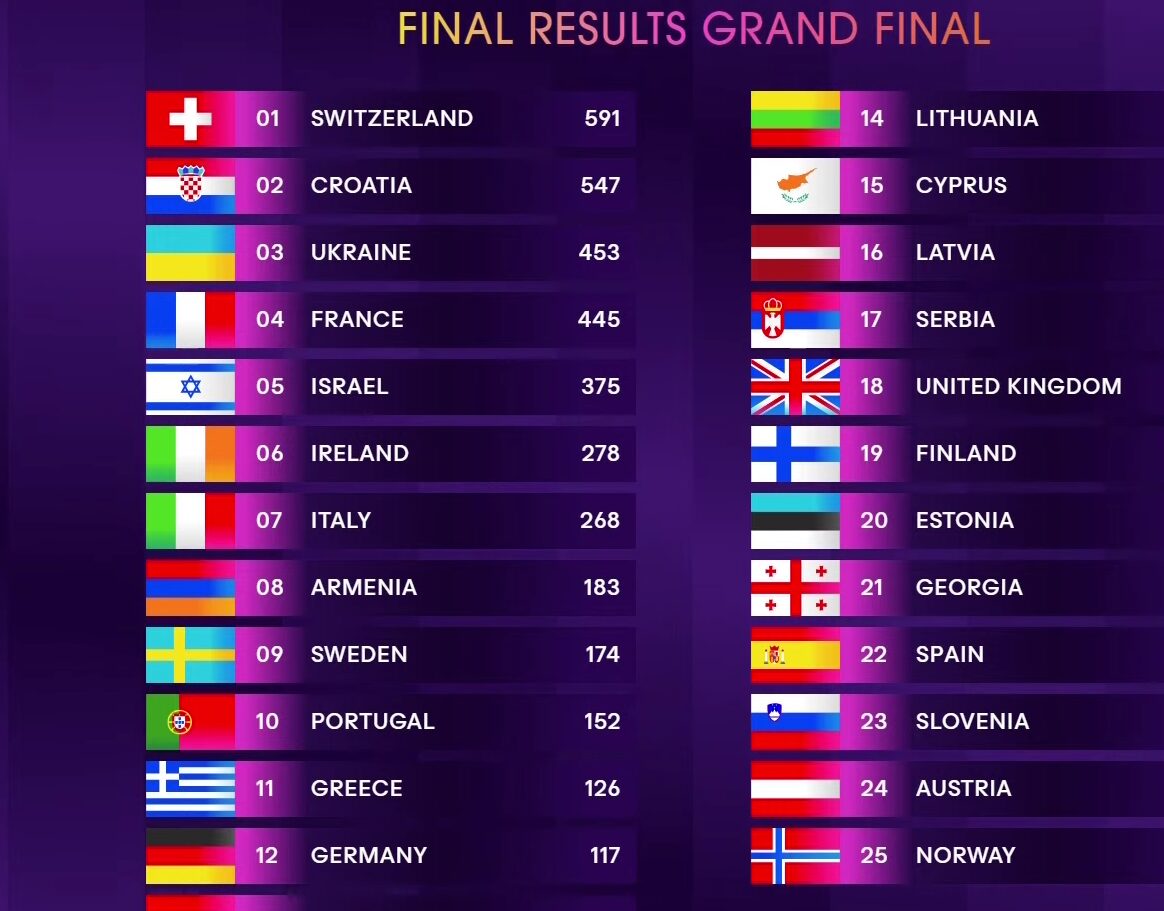 Nemo je pjesmom “The Code” ukupno osvojio 591 bod (365 bodova žirija i 226 publike). Baby Lasagna i njegova “Rim Tim Tagi Dim” osvojili su 547 bodova (210 po žiriju i 337 publike).