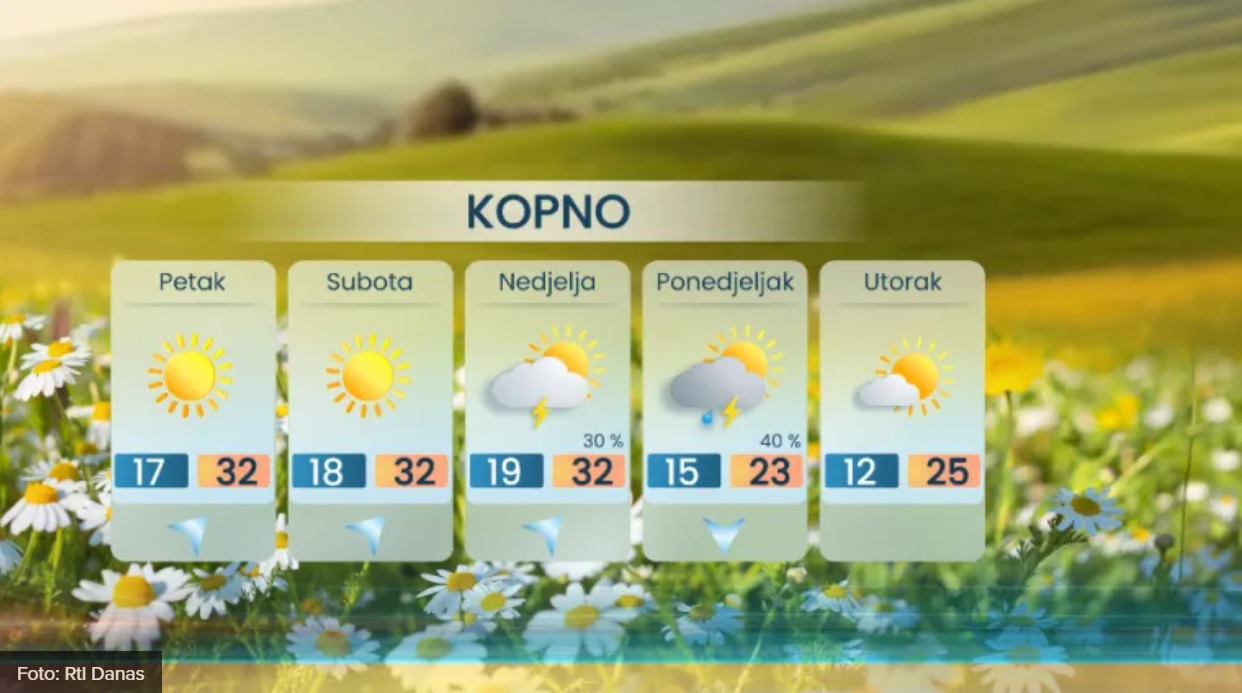 Do kraja tjedna u unutrašnjosti će prevladavati sunčano vrijeme uz iznadprosječne temperature – danju će biti vruće, a tijekom vikenda ponegdje i noći mogu ostati tople. Osvježenje se očekuje krajem nedjelje i tijekom noći na ponedjeljak, kada će doći do prolaznog naoblačenja, a moguće su i lokalno izraženiji pljuskovi s grmljavinom. Uz to će vjetar promijeniti smjer na sjeverni, a temperature će osjetno pasti, no i dalje će biti razmjerno toplo za ovo doba lipnja.