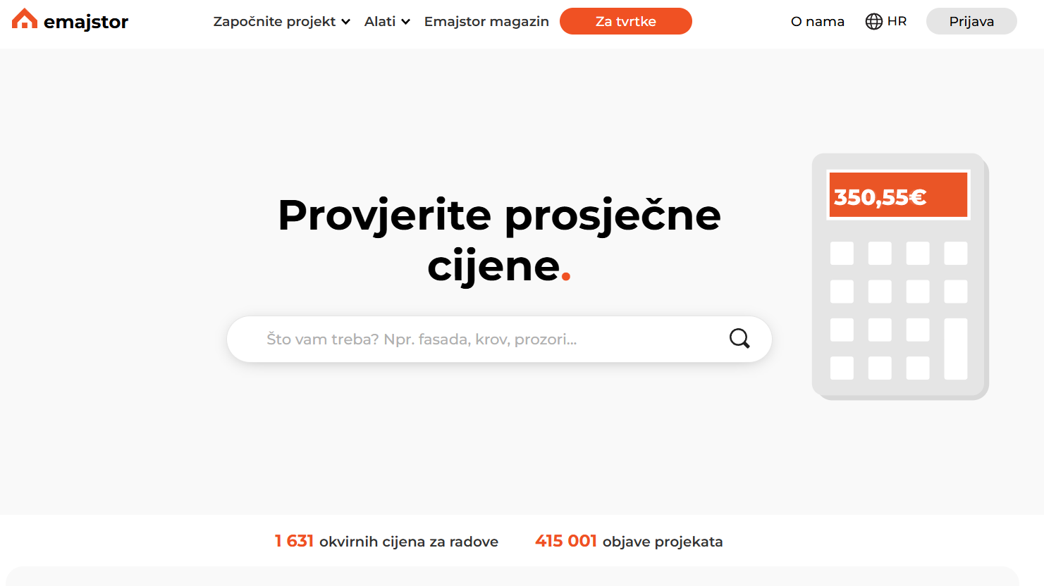 Ovaj alat prikazuje okvirne cijene različitih građevinskih usluga i materijala. Na Emajstor platformi se može pronaći preko 1.500 cijena za više od 200 kategorija.