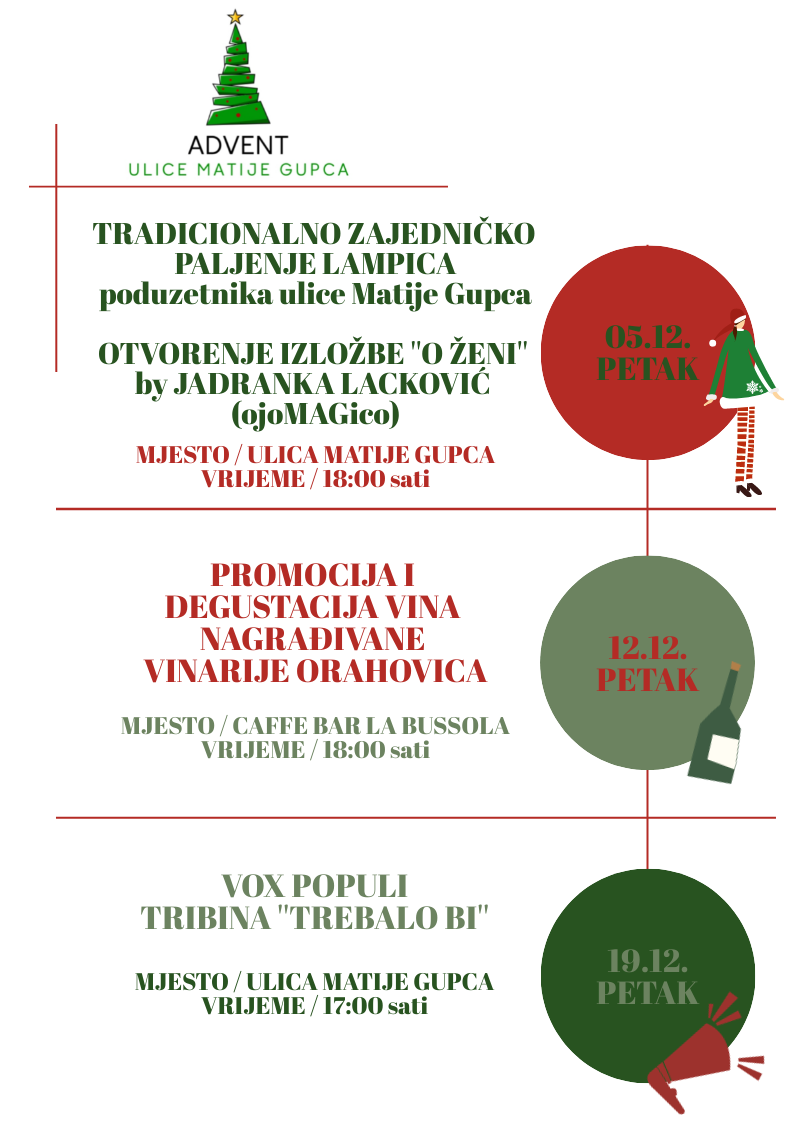 Tako će 12. prosinca u 18 sati u caffe baru La Bussola biti održana promocija i degustacija nagrađivanih vina vinarije Orahovica. Tjedan kasnije, 19. prosinca, u 17 sati slijedi tribina „Trebalo bi!“ u sklopu programa Vox Populi, koja će potaknuti otvoreni razgovor o temama važnima za lokalnu zajednicu.