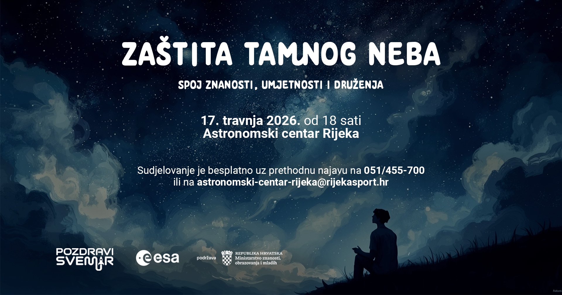 Astronomski centar Rijeka u četvrtak, 17. travnja, od 18 do 22 sata organizira događanje „Zaštita tamnog neba“, u sklopu projekta Pozdravi svemir. Program donosi sadržaj koji povezuje edukaciju, kreativnost i doživljaj neba, a osmišljen je kao otvoren i pristupačan susret za djecu, mlade i odrasle. Posebnu vrijednost večeri daje i njegovanje inkluzivnosti riječke multikulturalnosti kroz zastupljenost različitih jezičnih izričaja.