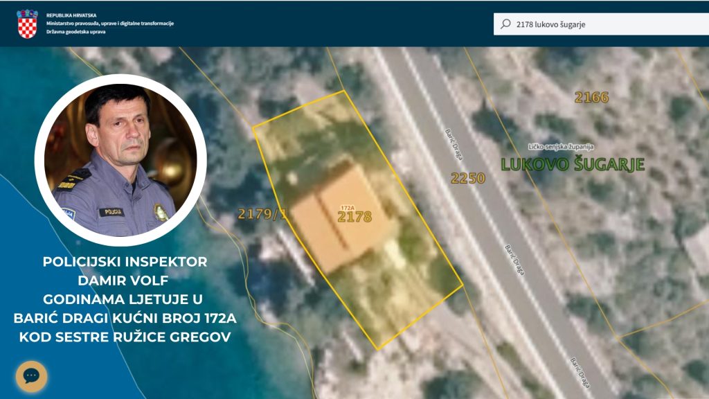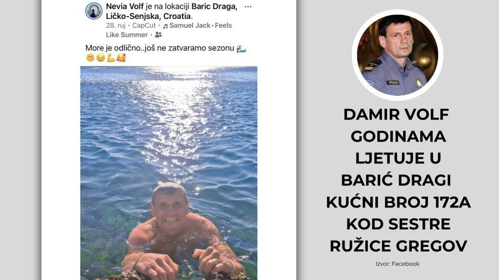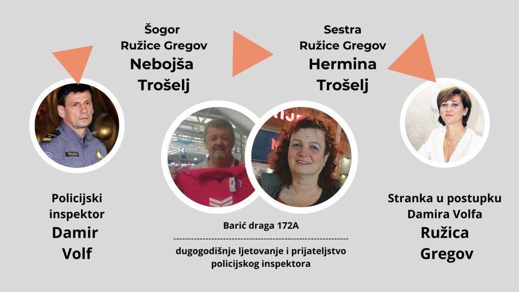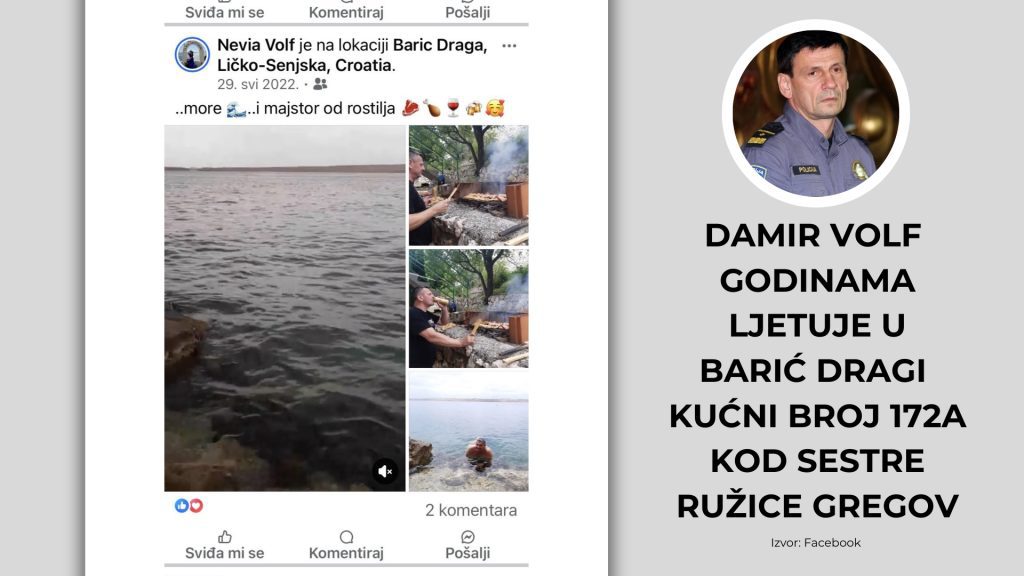 Dodatno, iz javnih objava proizlazi da je inspektor Volf u više navrata boravio u Barić Dragi kućni broj 172a, odnosno Ličko-senjskoj županiji, gdje redovito ljetuje kod obitelji gospođe Gregov. Tu povezanost javno je potvrdio i sam gospodin Nebojša Trošelj, šogor Ružice Gregov, ničim izazvan, na mojem Facebook profilu.
