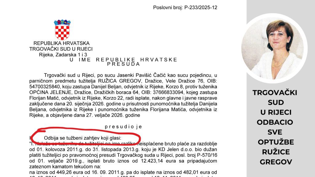 Podsjetimo, optužnicom se okrivljenik tereti da je “u razdoblju od 5. studenoga 2020. do 14. travnja 2022. u Jelenju i Rijeci, kao načelnik Općine Jelenje poduzeo radnje u cilju da jednoj osobi onemogući naplatu potraživanja od komunalnog društva čiji je osnivač Općina, a koje je potraživanje u iznosu od 28.397,45 eura s pripadajućim zateznim kamatama ta osoba ostvarila na temelju pravomoćne i ovršne presude Trgovačkog suda u Rijeci.”. Međutim, u petak, 27. veljače objavljena je presuda Trgovačkog suda u Rijeci kojom se odbacuju svi zahtjevi Ružice Gregov protiv Općine Jelenje.