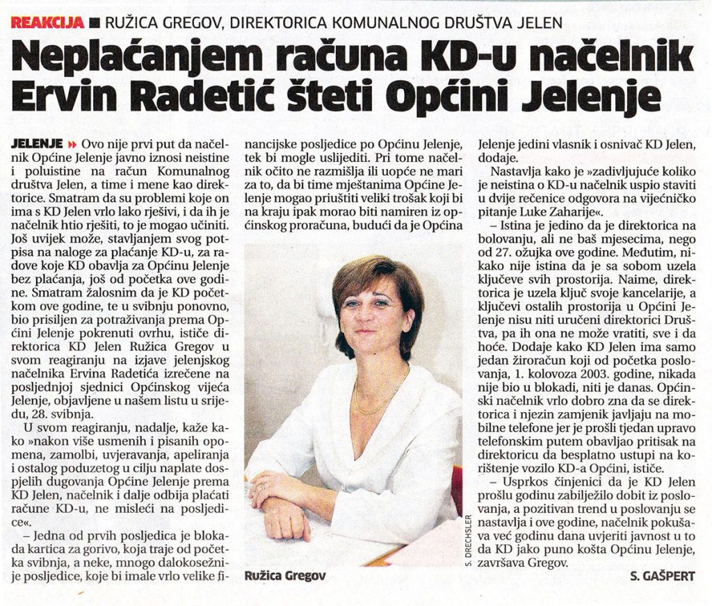 Na jednom od sastanaka bio je prisutan i suprug Ružice Gregov koji po mojim saznanjima nije imao nikakve veze sa Komunalnim društvom a još manje sa Općinom Jelenje. Ponovio bih riječi supruga Dražena Gregova upućenog meni na jednom od sastanaka. Citiram: „Isplati nam te novce, šta te briga, nisu to tvoje pare“.