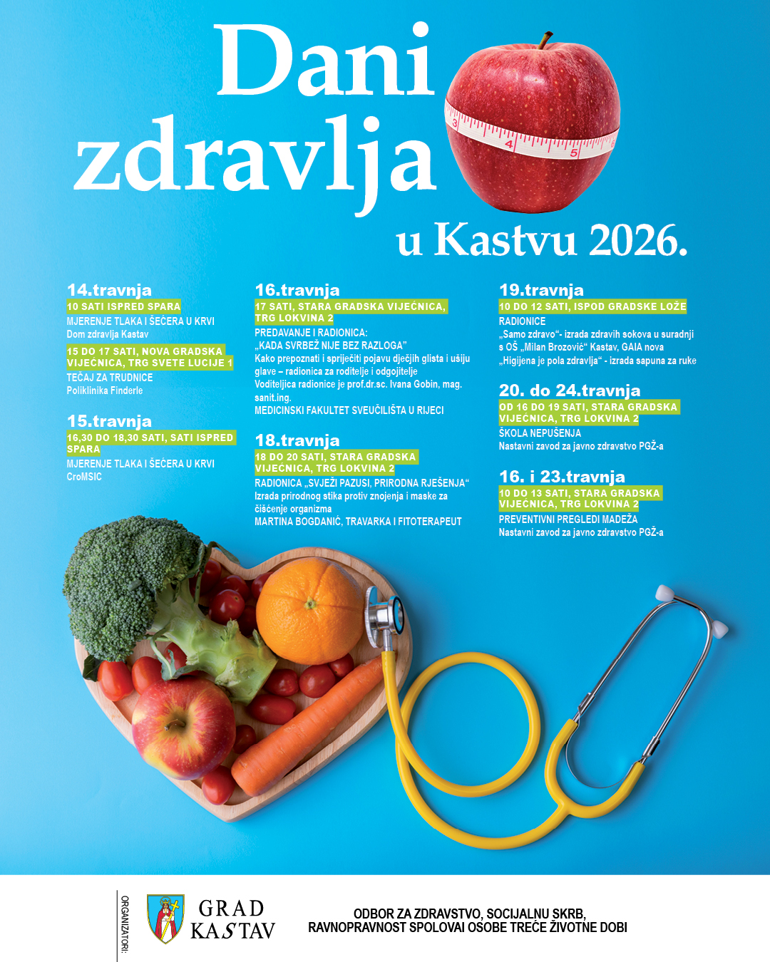 Program započinje 14. travnja mjerenjem tlaka i šećera u krvi ispred Spara, u terminu od 10 sati, u organizaciji Doma zdravlja Kastav. Već idućeg dana, 15. travnja, građani će ponovno moći provjeriti tlak i šećer u krvi (od 16:30 do 18:30 sati, ispred Spara, u organizaciji CroMSIC-a), dok će se u jutarnjim satima (od 10 sati) održati i tečaj za trudnice u novoj gradskoj vijećnici na Trgu svete Lucije 1, u organizaciji Poliklinike Finderle.