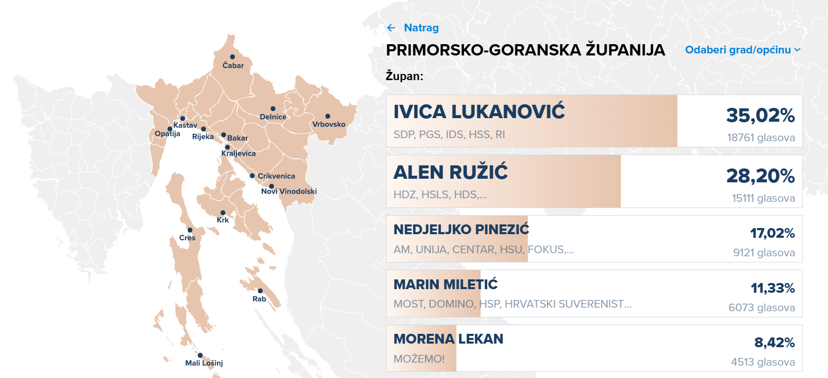 Slijedi ih Nedjeljko Pinezić (AM-UK-Centar-HSU-Fokus-Alternativa) s 17,02 %, a četvrti je Mostov Marin Miletić s 11,33 %. Morena Lekan (Možemo!) osvojila je povjerenje 842% birača.