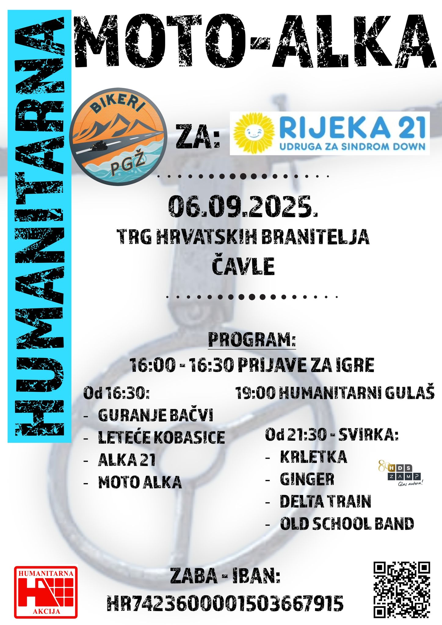 Program počinje od 16:00 sati prijavama za moto alku, a zatim kreću moto igre i zabavni sadržaji. Posjetitelji će moći donirati u poznatu “škrabicu” – papirnatim i kovanicama – ili uplatiti donaciju izravno na poseban žiro račun humanitarne akcije: