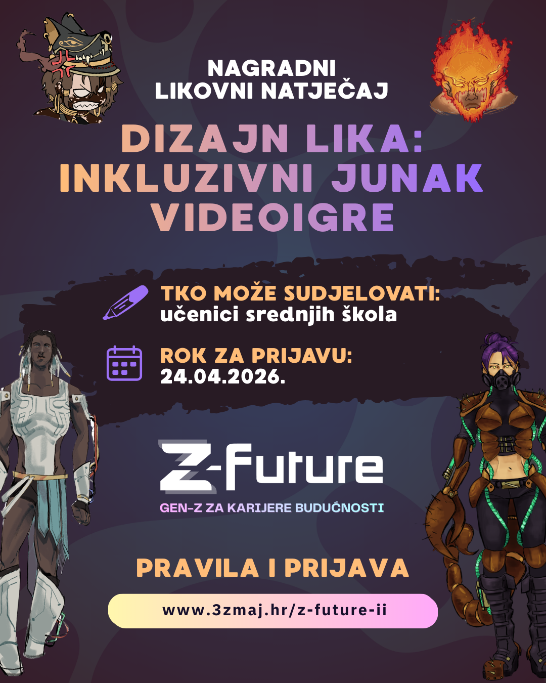 U sklopu projekta Z-FUTURE II: GenZ za karijere budućnosti, Udruga 3. zmaj raspisala je i ove godine kreativni likovni i literarni natječaj pod nazivom “Dizajn lika – Inkluzivni junak videoigre”, koji poziva srednjoškolce iz cijele Hrvatske da pokažu svoju kreativne vještine.