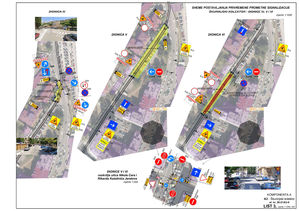 Početni radovi odnose se na uklanjanje pokrovne ploče Škurinjskog kolektora u završnom sjevernom dijelu ulice (DIONICA IV) zauzećem kompletne širine kolnika i uvođenjem zabrane prometa u predmetnom segmentu ulice. Južni dio ulice biti će slobodan za prilaz kao slijepi ogranak. Pješaci se usmjeravaju na zapadni nogostup. Pripadajući dio parkirališta sastavni je dio zauzete površine.
