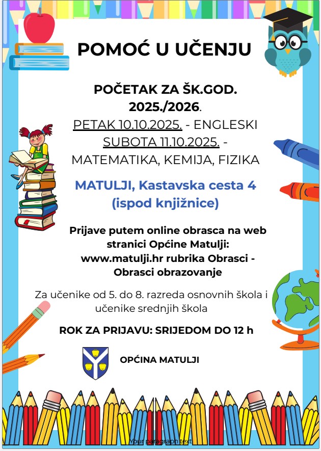 U sklopu programa Pomoć u učenju poduke će se održavati iz četiri predmeta: matematike, kemije, fizike i engleskog jezika. Program započinje u petak popodne 10.10.2025. za predmet engleski jezik, a u subotu ujutro 11.10.2025. godine za predmete: matematika, kemija i fizika. Poduke su financirane od strane Općine Matulji.