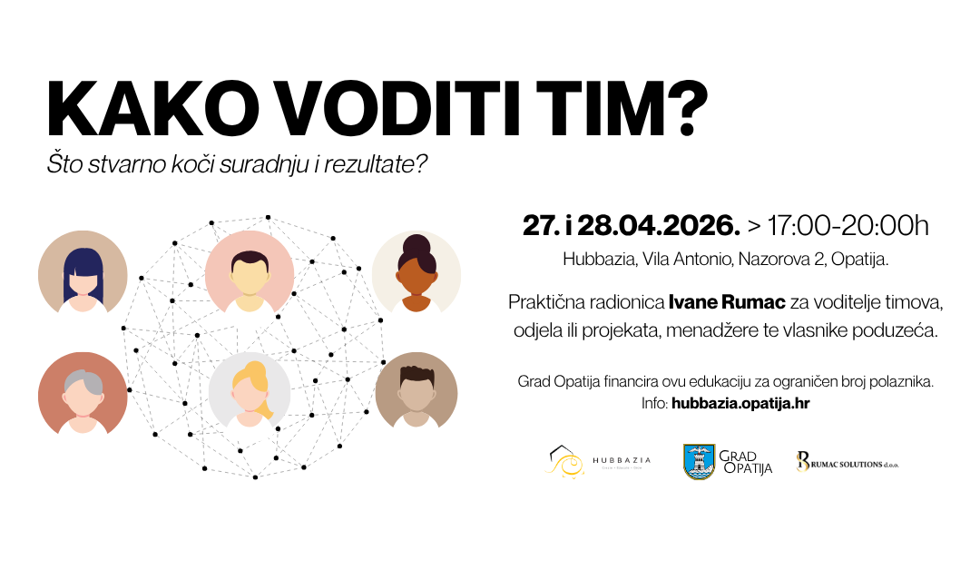 Grad Opatija i poduzetnički inkubator Grada Opatije – Hubbazia pozivaju voditelje timova, voditelje odjela i projekata, menadžere te vlasnike poduzeća koji upravljaju ljudima i odgovornostima na radionicu „Kako voditi tim: što stvarno koči suradnju i rezultate?“, koja će se održati 27. i 28. 4. 2026. od 17 – 20h u Hubbaziji, Vila Antonio, Nazorova 2, Opatija.