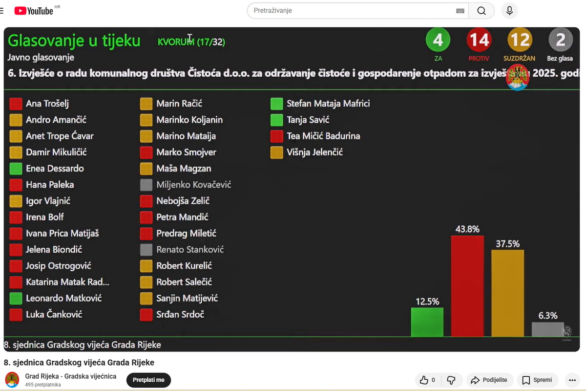 Gradsko vijeće Grada Rijeke na 8. sjednici jednoglasno je prihvatilo Deklaraciju o hrvatskom prostoru, potvrdivši opredijeljenost za kvalitetu arhitekture, javni interes i transparentnost. Rasprava je ukazala na ograničene ovlasti lokalne samouprave i potrebu za konkretnim potezima, uključujući preispitivanje Zakona o prostornom uređenju. Istodobno, izvješće KD Čistoća za 2025. nije prihvaćeno, zbog pada prihoda i rasta troškova.