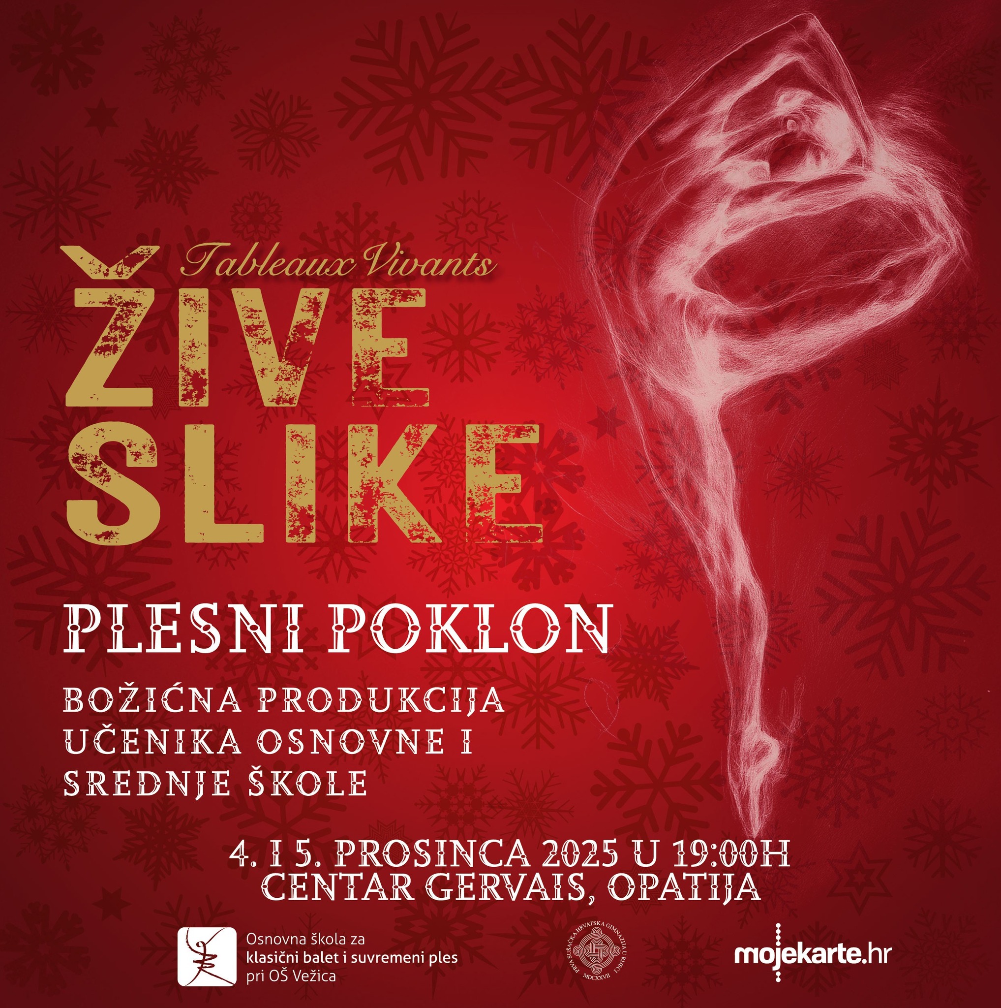 Tradicionalna božićna produkcija učenika OŠ za klasični balet i suvremeni ples pri OŠ Vežica te Plesnog odjela Prve sušačke hrvatske gimnazije u Rijeci ove se godine održava 4. i 5. prosinca u Centru Gervais u Opatiji. Ovogodišnje izdanje, pod nazivom „Žive slike”, tematski je inspirirano svijetom slikarstva i likovne umjetnosti, što će publika moći prepoznati u konceptu, vizualnom identitetu i koreografskim rješenjima.