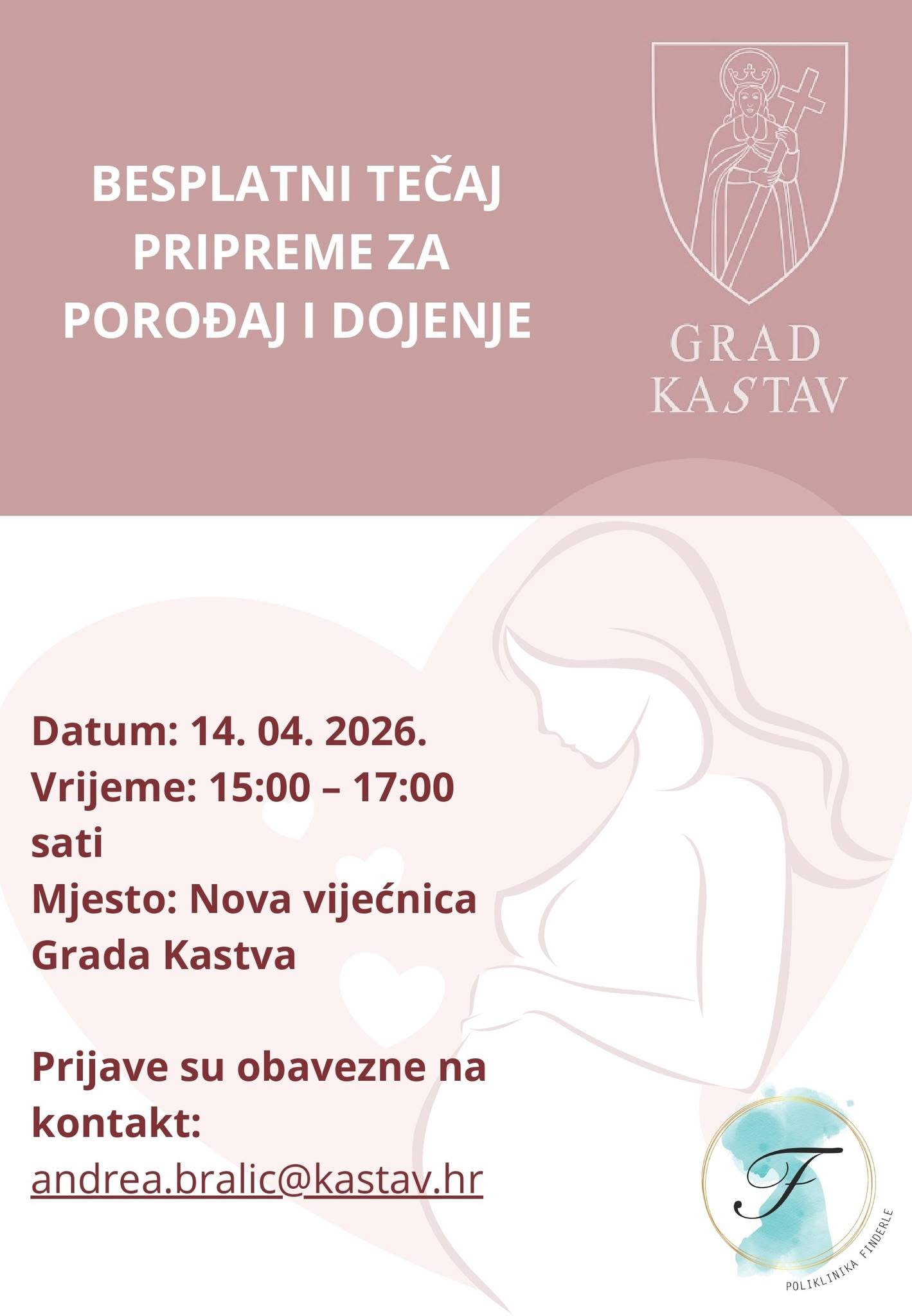 U sklopu programa Dani zdravlja 2026., Grad Kastav u suradnji s Poliklinikom Finderle organizira besplatan tečaj pripreme za porođaj i dojenje namijenjen budućim majkama s područja Kastva.