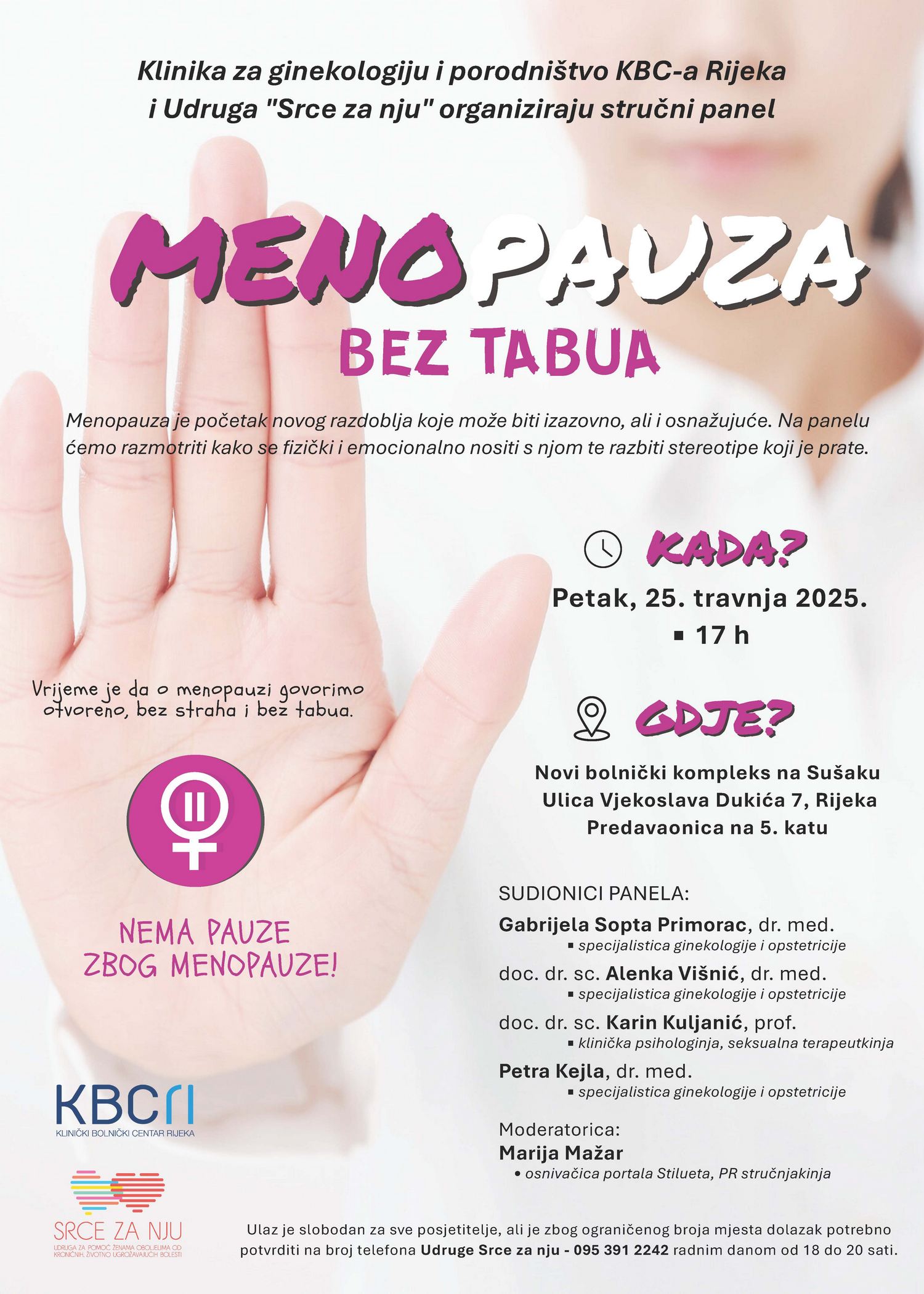 U organizaciji Klinike za ginekologiju i porodništvo KBC-a Rijeka i riječke Udruge „Srce za nju“ održat će se javnozdravstveni panel „Menopauza bez tabua“. Menopauza je početak novog razdoblja koje može biti izazovno, ali i osnažujuće. Panelisti će dati konkretne savjete i preporuke kako se emocionalno i fizički nositi s menopauzom i razbiti stereotipe koji je prate.