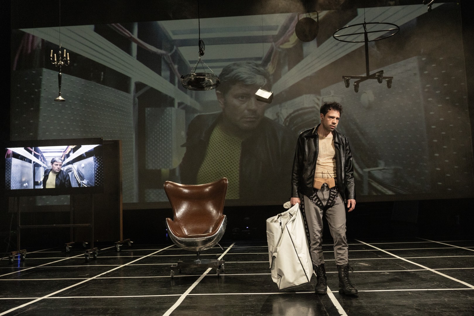 U središtu je psiholog Kris Kelvin (Matija Čigir), suočen s “gostima” – pojavama nastalim iz fragmenata sjećanja i nesvjesnog. Hari (Rea Bušić), dvojnica preminule partnerice, istodobno je opipljivo prisutna i radikalno nestvarna: tijelo i pokret pripadaju glumici, dok deepfake tehnologija povremeno “posuđuje” njezino lice iz filmskog arhiva. U jednom se trenutku na sceni susreću tri Hari – ona iz filma, ona kazališna i ona računalno generirana – i upravo u toj tankoj pukotini između medija nastaje „SOLARIS DVA“.