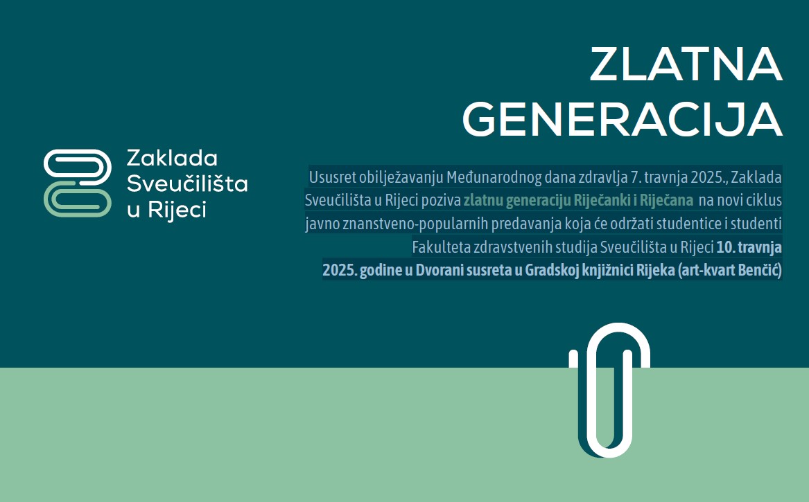 Ususret obilježavanju Međunarodnog dana zdravlja Zaklada Sveučilišta u Rijeci poziva zlatnu generaciju Riječanki i Riječana na novi ciklus javno znanstveno‑popularnih predavanja koja će se održati 10. travnja 2025. godine, s početkom u 11 sati u Dvorani susreta u Gradskoj knjižnici Rijeka (art-kvart Benčić)