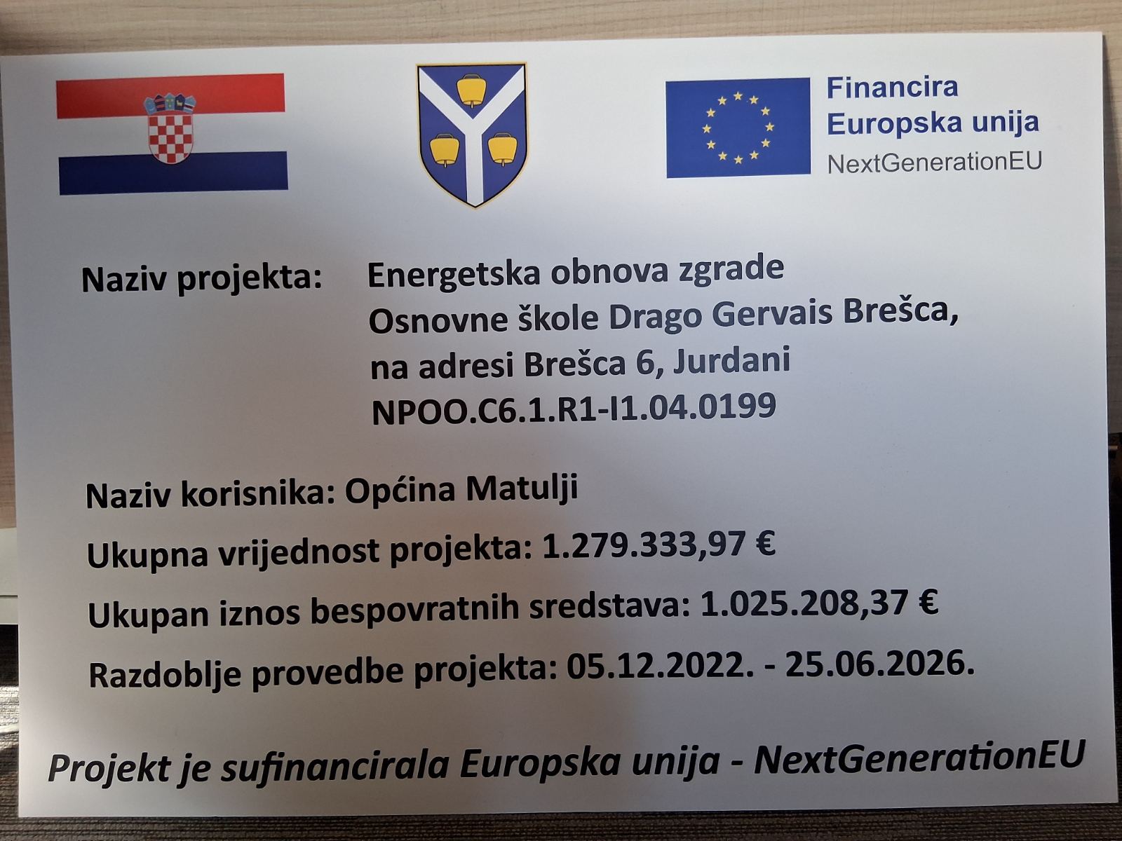 Ugovorom o dodjeli bespovratnih sredstava, koji su u lipnju 2024. godine potpisali Ministarstvo prostornog uređenja, graditeljstva i državne imovine RH, Fond za zaštitu okoliša i energetsku učinkovitost RH i Općina Matulji, Općini Matulji dodijeljena su bespovratna sredstva u iznosu od 1.025.208,37 eura, što je ujedno i najviši mogući iznos sufinanciranja.