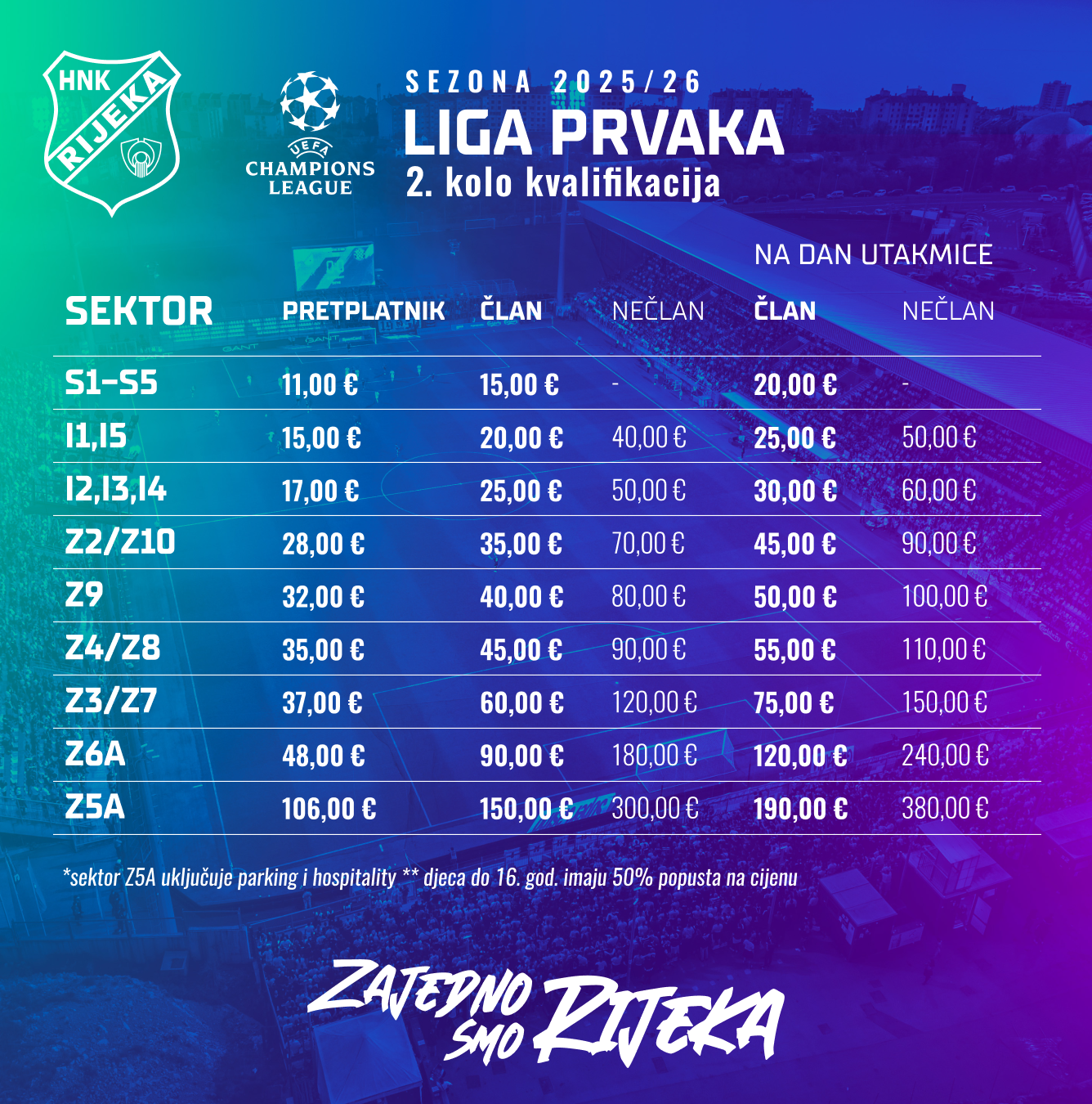 Djeca do 16 godina imaju 50 posto popusta, a umirovljenici imaju 50 posto popusta na obiteljskim sektorima (Z2, Z10, I1A, S1A). Popust se može ostvariti isključivo na blagajnama kampa HNK Rijeka.