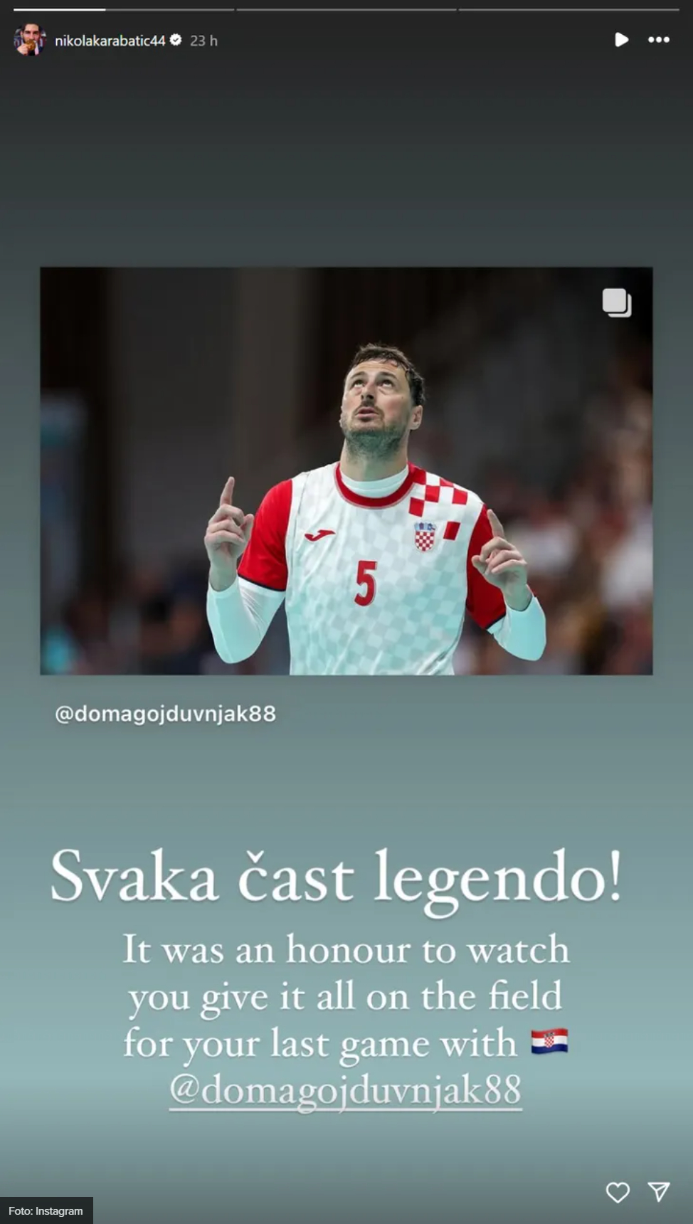 „Svaka čast, legendo“, napisao je Karabatić, a potom dodao: „It was an honor to watch you give everything on the court in your last match for Croatia”, prenosi Net.hr.