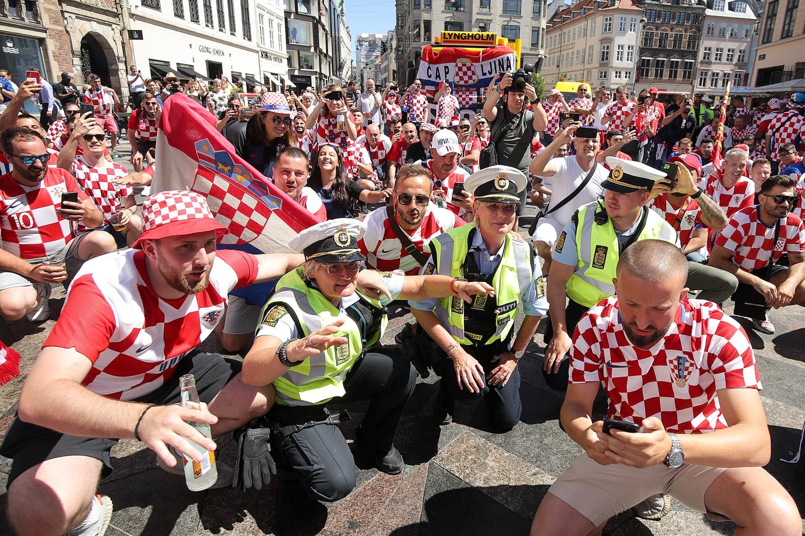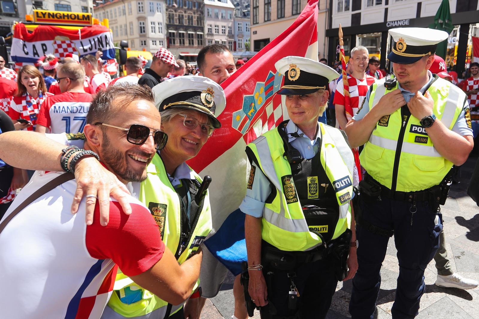 Danas poslijepodne s hrvatskim navijačima u centru Kopenhagena su navijali i danski policajci! ‘Kockice’ su preplavile grad. Pjevale su se navijačke pjesme poput “Bježite ljudi, bježite iz grada” i “Moja domovina”.