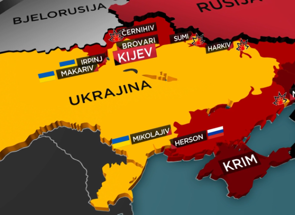 Karta rata u Ukrajini mjesec dana od invazije: Herson je jedini veći grad koji su Rusi osvojili
