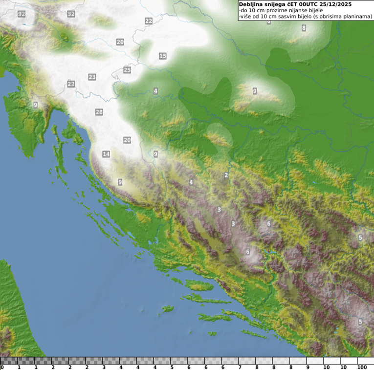 Na Badnjak oborine će zahvatiti cijelu zemlju. Tijekom noći, s dolaskom hladnog zraka, kiša će u Gorskom kotaru i Lici prelaziti u susnježicu i snijeg, s mogućim stvaranjem snježnog pokrivača. Snijeg se očekuje i u drugim gorskim područjima, te ponegdje u nizinama, posebno na sjeverozapadu Hrvatske. Unutrašnjost će zahvatiti umjeren sjeveroistočnjak, u gorju i jak, što može izazvati mećavu i snježne zapuhe. Istovremeno, bura na sjevernom Jadranu jačat će do olujnih i orkanskih udaraca, dok će na dalmatinskoj obali puhati jako, ujutro i olujno jugo.