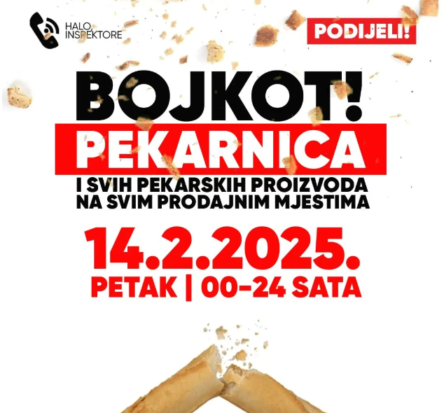 Platforma Halo, inspektore, koja tjednima organizira bojkote trgovina, sada poziva na novi bojkot. Bojkot pekarnica i svih pekarskih proizvoda na svim prodajnim mjestima, u petak, 14.2.