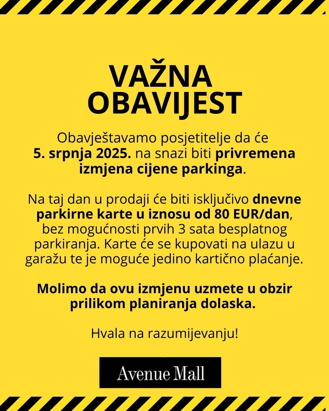Zbog koncerta Marka Perkovića Thompsona, koji će se održati u blizini zagrebačkog Hipodroma i na kojem se očekuje čak pola milijuna posjetitelja, predviđa se velika prometna gužva. Avenue Mall je na svojim društvenim mrežama obavijestio javnost o privremenoj promjeni parkirnog režima toga dana. Naime, tog dana u garaži centra neće vrijediti standardno pravilo o tri sata besplatnog parkiranja. Umjesto toga, moguće će biti samo kupiti dnevnu kartu po cijeni od 80 eura, i to isključivo karticama.