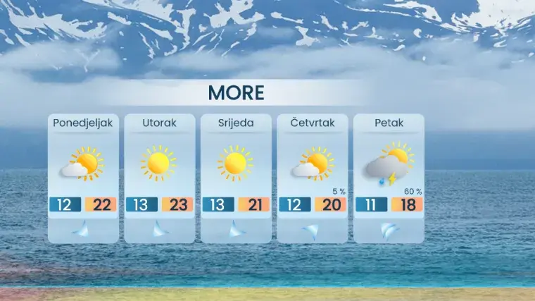 Na sjevernom Jadranu samo prolazno malo oblaka u unutrašnjosti Istre, na riječkom području i u gorju. No, i ovdje ostaje većinom sunčano, a bit će i malo toplije nego danas uz samo ponegdje slab jugozapadnjak. Temperatura između 19 i 22 °C, malo niža u višem gorju.