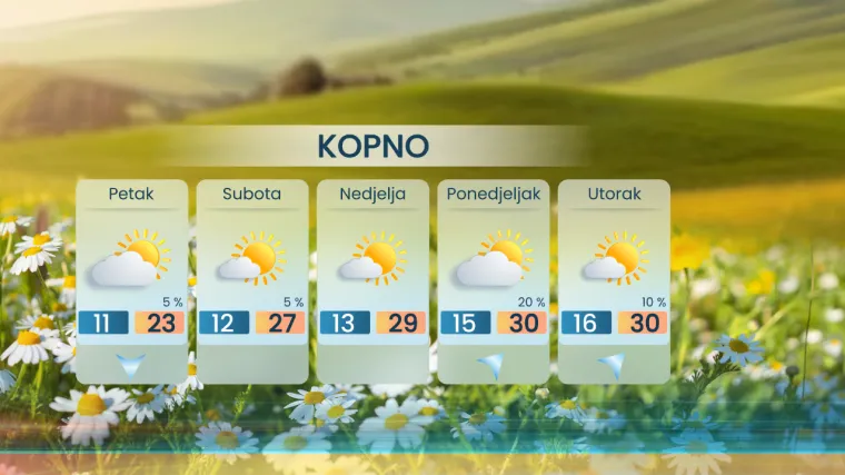 U unutrašnjosti promjenjiva naoblaka još u petka, zatim napokon sunčanije, a od subote danju i osjetno toplije, nekima možda već i vruće. Pravi vrući dani izgledni su početkom idućeg tjedna, a toplije će biti i noću. Ipak, neće biti baš sasvim stabilno, ali većinom suho, samo mala šansa za poneki popodnevni pljusak postoji uglavnom oko gorja, izglednije u ponedjeljak.