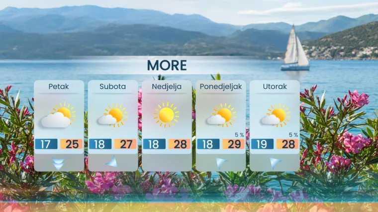 Na Sjevernom Jadranu slaba do umjerena bura i tramontana, a temperatura oko 23-24 pa i 25 stupnjeva, oko ili malo ispod 20 stupnjeva u gorju