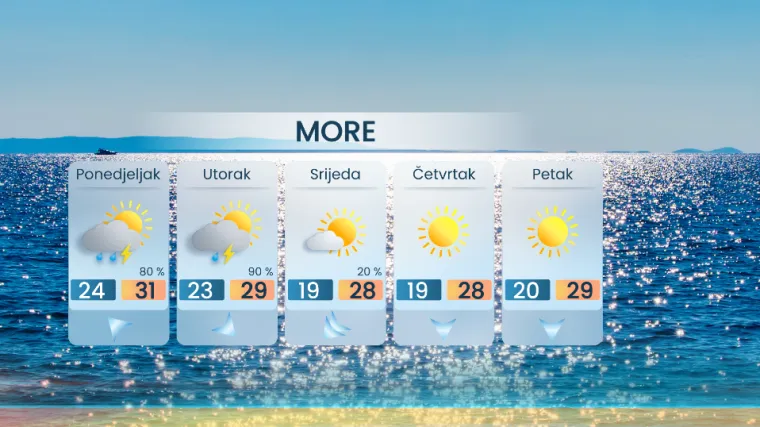 Na sjevernom Jadranu uz umjereno jugo i južni vjetar sve oblačnije i vrlo nestabilno. Mogući su isprva kraći pljuskovi i grmljavina, a onda prema večeri lokalno moguće i jače nevrijeme praćeno olujnim vjetrom i tučom, najprije u Istri, zatim na Kvarneru i u Gorskome kotaru.