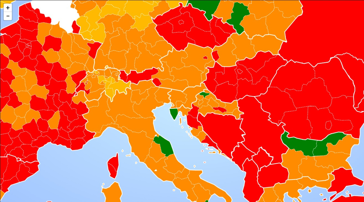 Kako prenosi Glas Istre, ministarstvo vanjskih poslova Kraljevine Belgije objavilo je kartu Europe koja je podijeljena u zelena, svijetlo i tamnonarnčasta te crvena područja.
